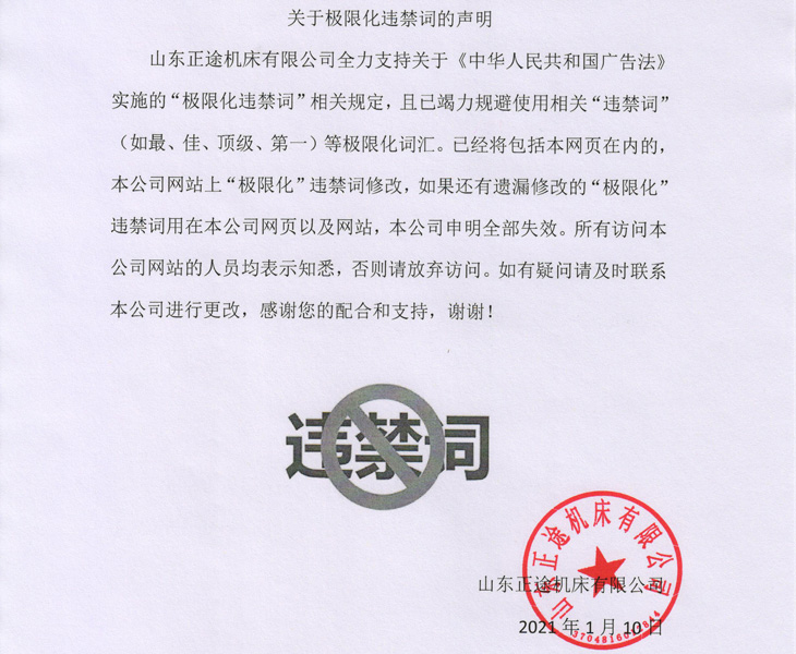 山东正途机床有限公司全力支持关于《中华人民共和国广告法》实施的“极限化违禁词”相关规定,且已竭力规避使用相关“违禁词”(如最、佳、顶级、第一)等极限化词汇。已经将包括本网页在内的,本公司网站上“极限化”违禁词修改,如果还有遗漏修改的“极限化”违禁词用在本公司网页以及网站,本公司申明全部失效。所有访问本公司网站的人员均表示知悉,否则请放弃访问。如有疑问请及时联系本公司进行更改,感谢您的配合和支持,谢谢!